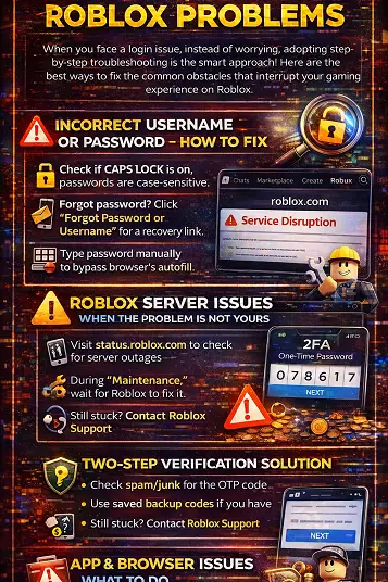 Roblox login problems are essentially the technical obstacles that prevent players from accessing their accounts. These issues often include errors like “Invalid Username or Password,” not receiving verification codes (2FA), or the app repeatedly crashing. Sometimes these problems occur on the user’s side (such as poor internet connection or forgotten passwords), and sometimes they happen because Roblox’s own servers are down. Their main purpose is to ensure account security, and with the right troubleshooting steps, they can be resolved within just a few minutes.